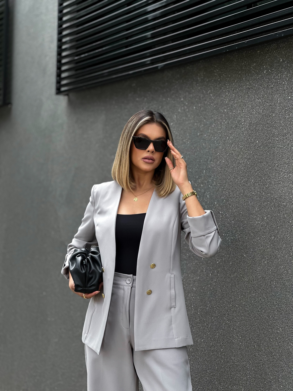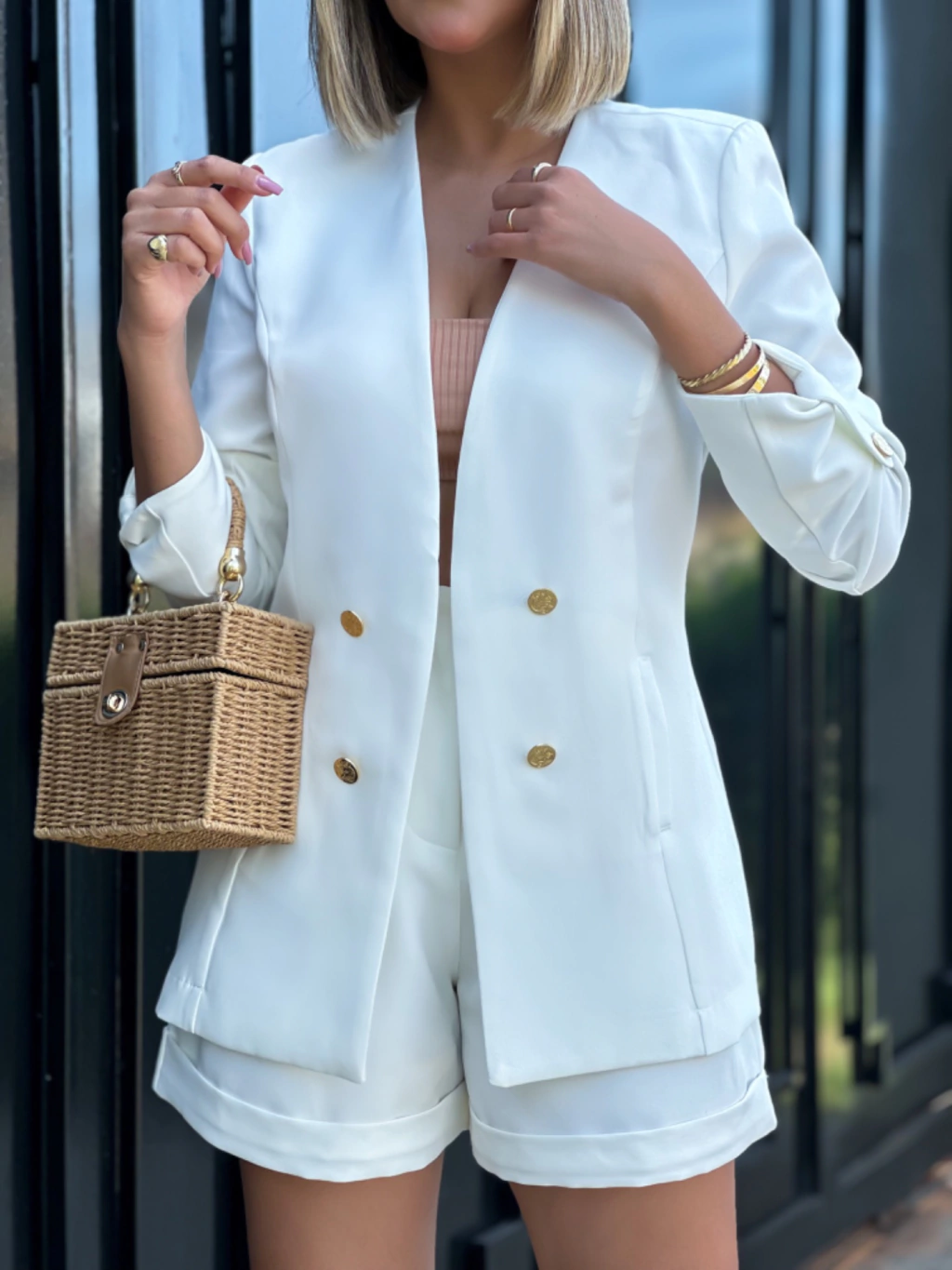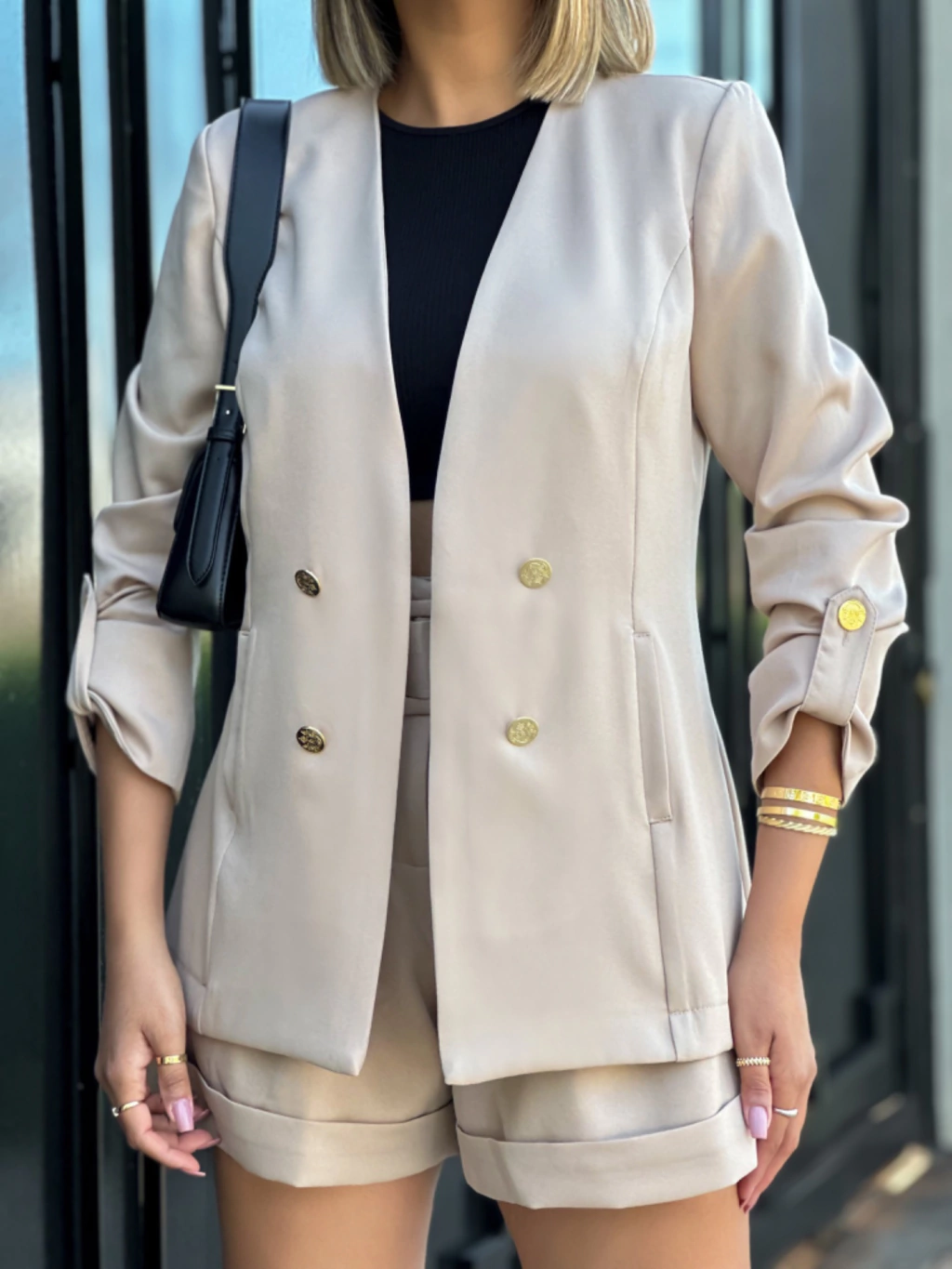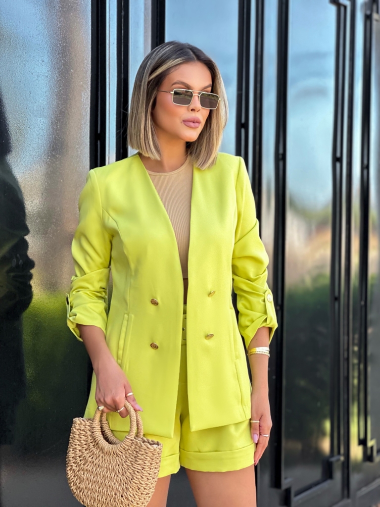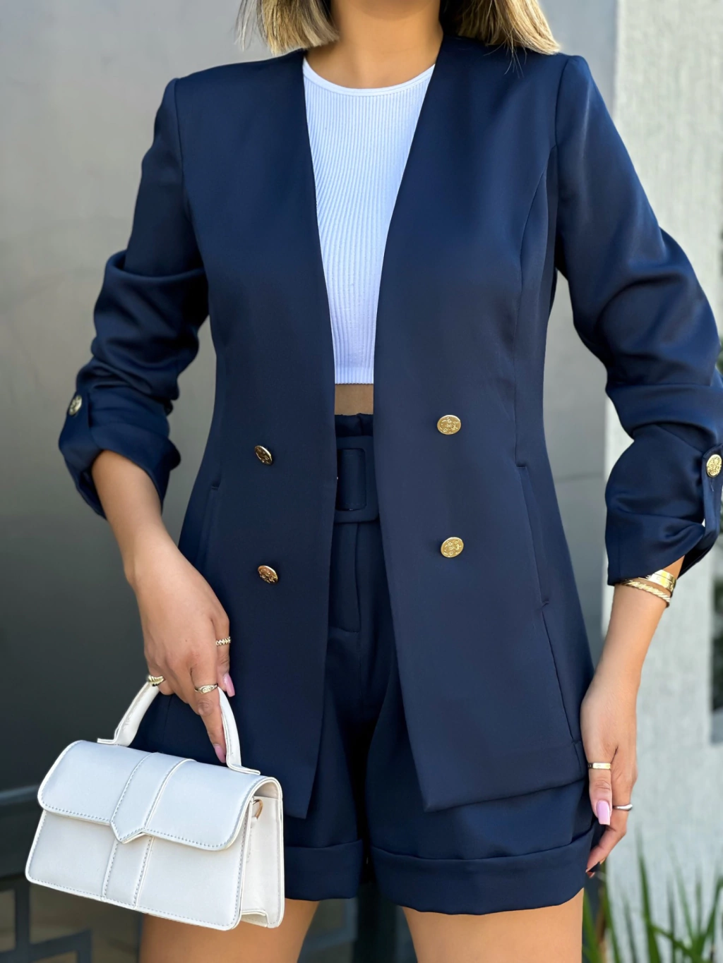 Blazer alongado com manga longa. Possui botão lateral na manga possibilitando usá-lo com a manga 3/4. Blazer sem gola, sem forro, com dois bolsos frontais embutidos e botões