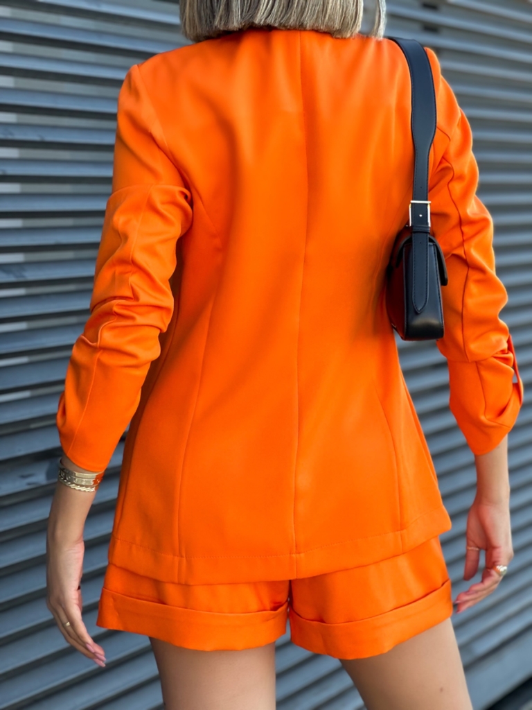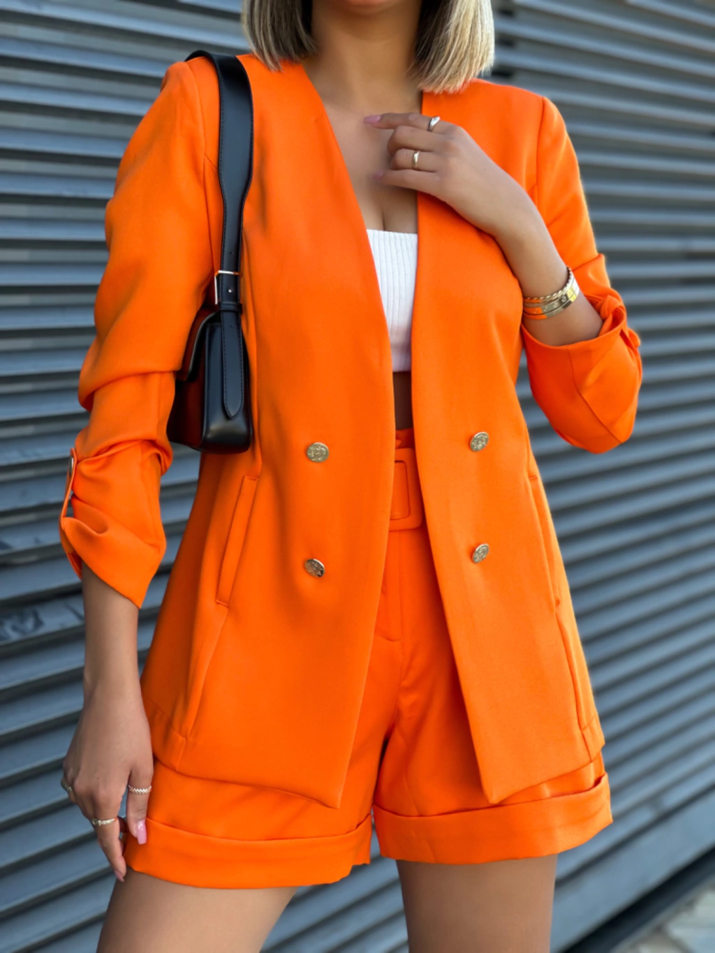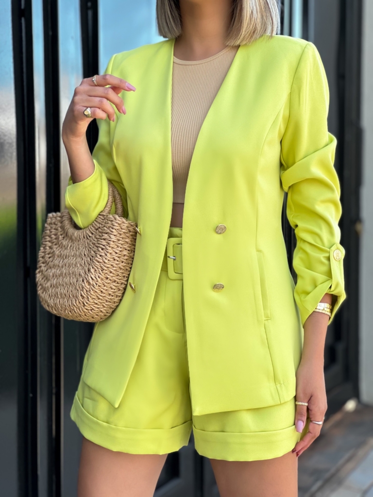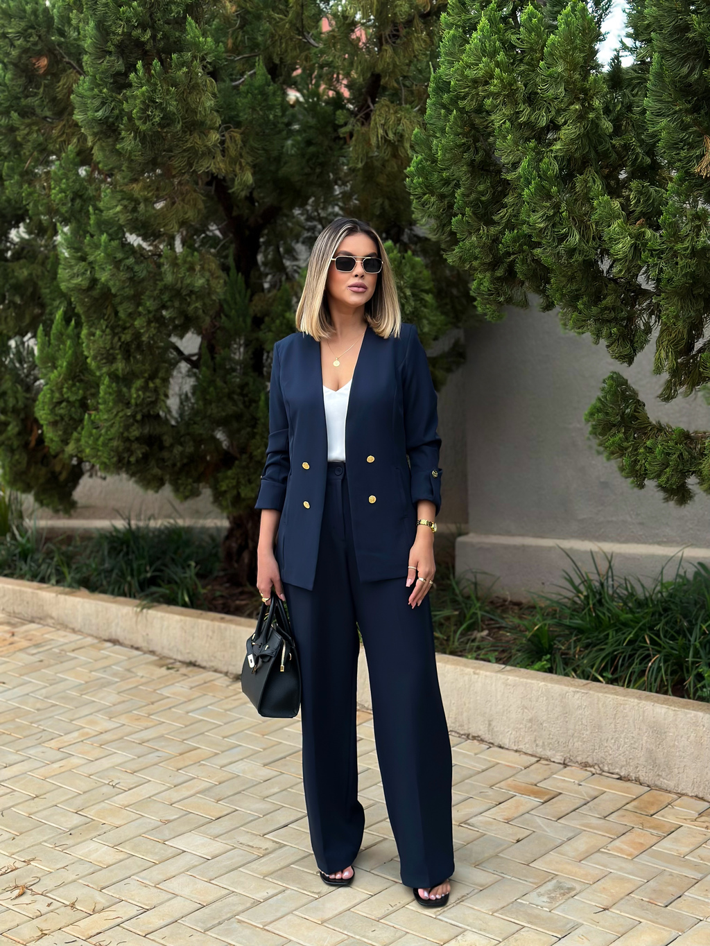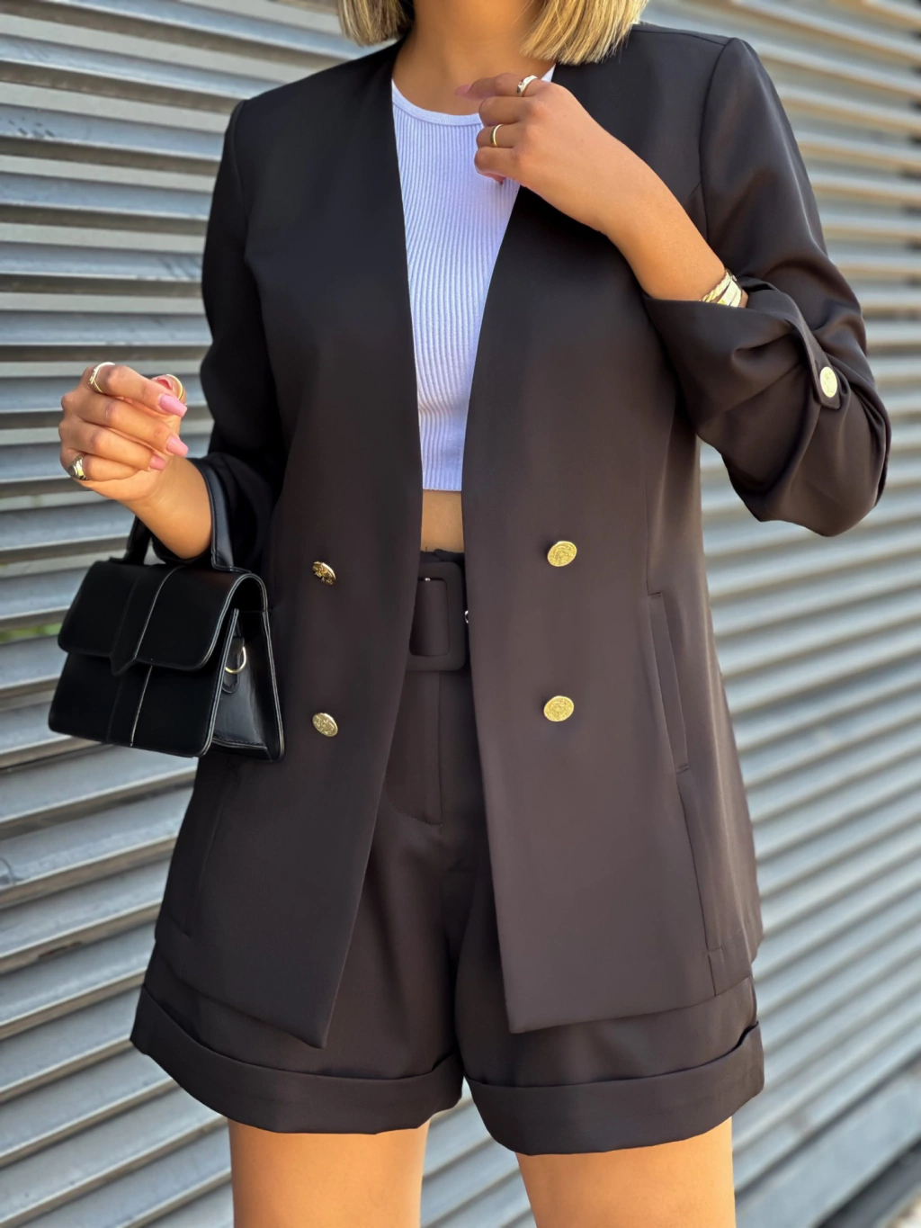 Blazer alongado com manga longa. Possui botão lateral na manga possibilitando usá-lo com a manga 3/4. Blazer sem gola, sem forro, com dois bolsos frontais embutidos e botões