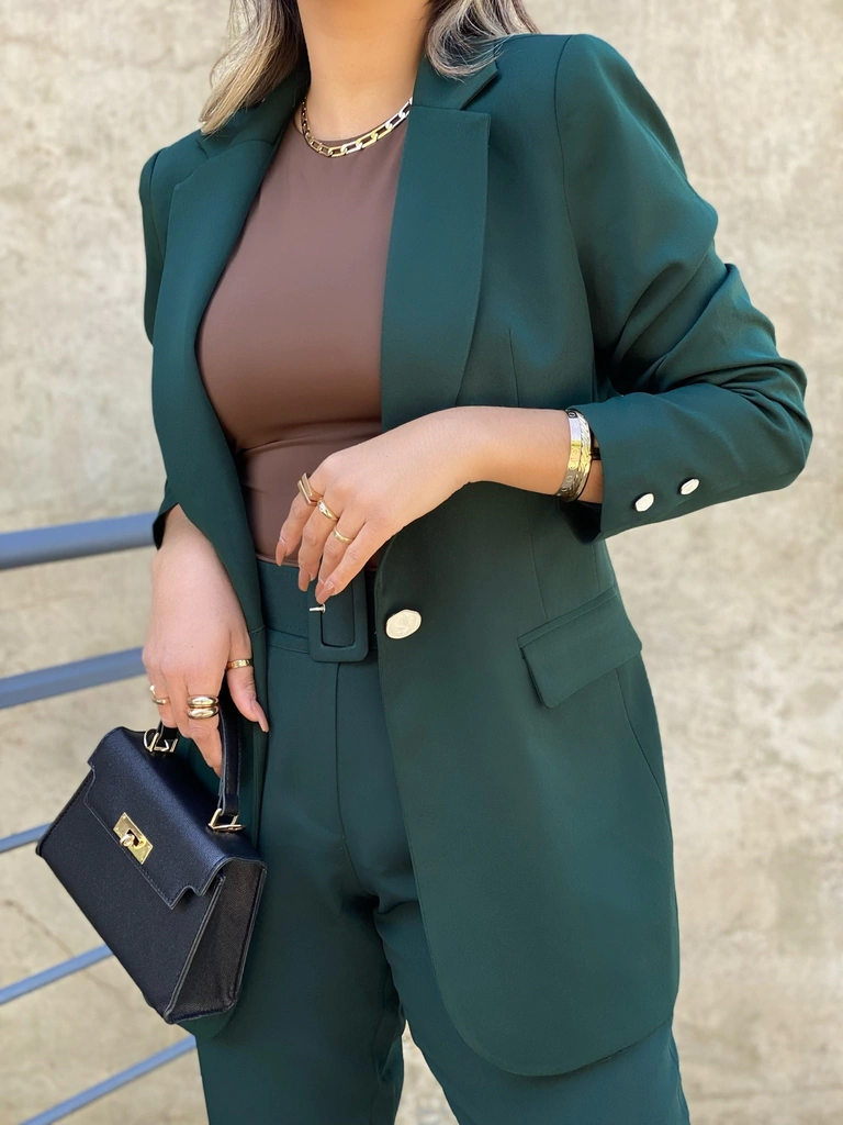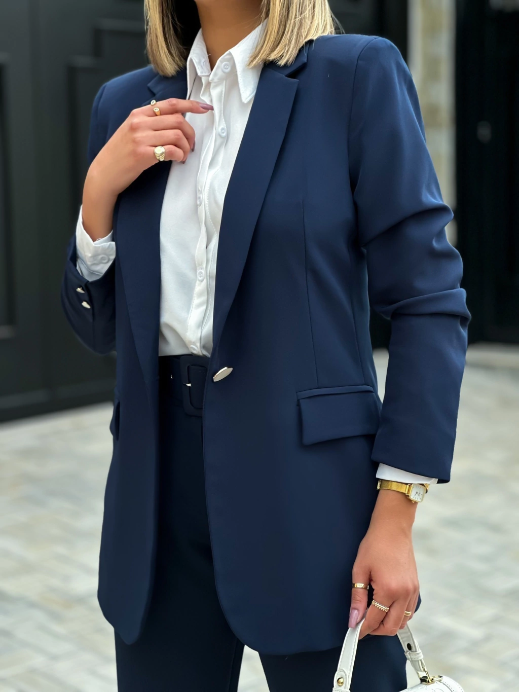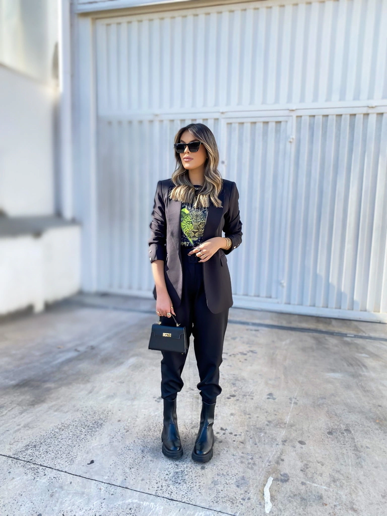 O Blazer Madrepérola é um blazer elegante e encorpado. Modelo alongado, forrado, com ombreiras, dois botões em madrepérola nas mangas e um botão em madrepérola na parte frontal do blazer.