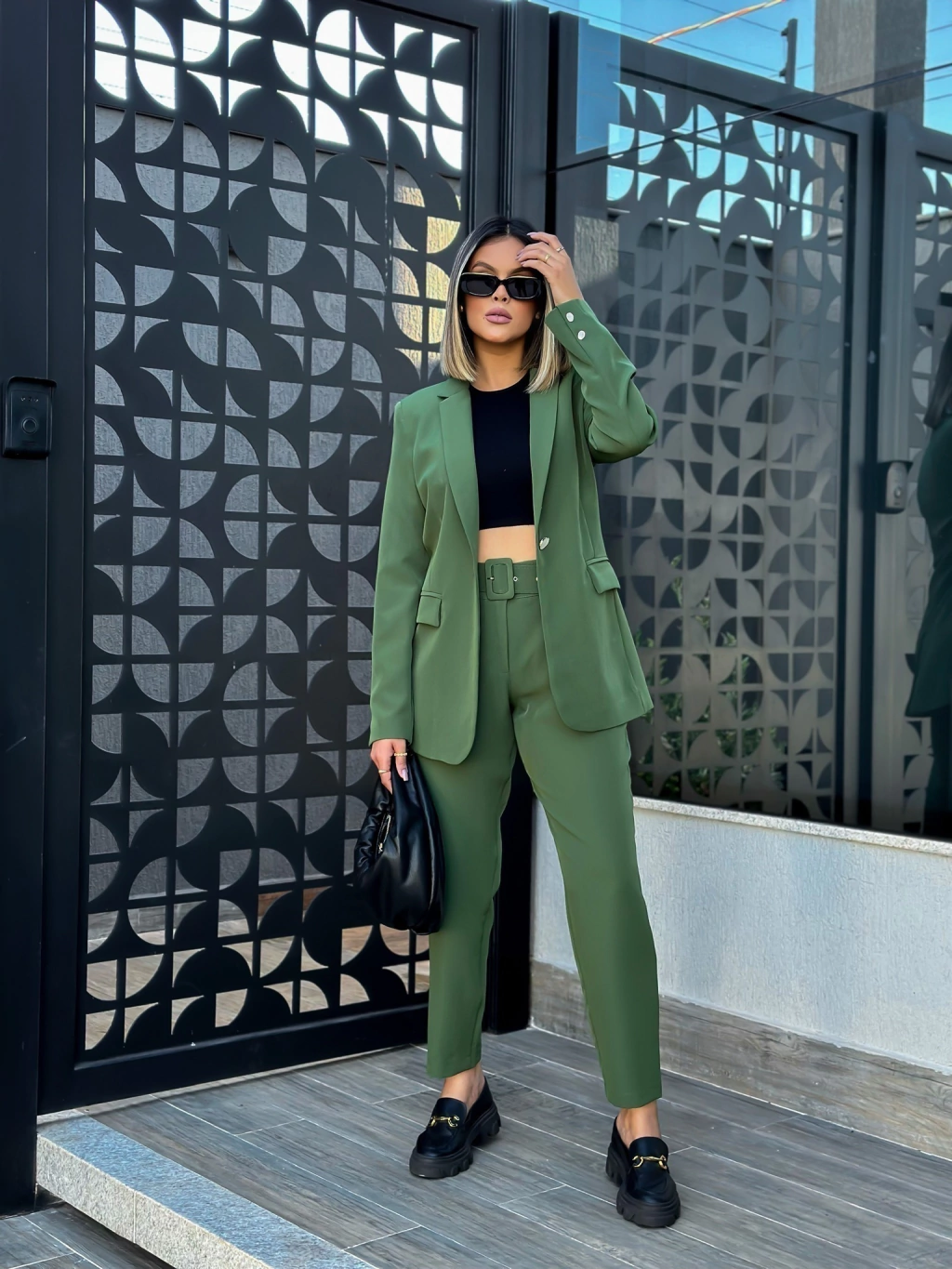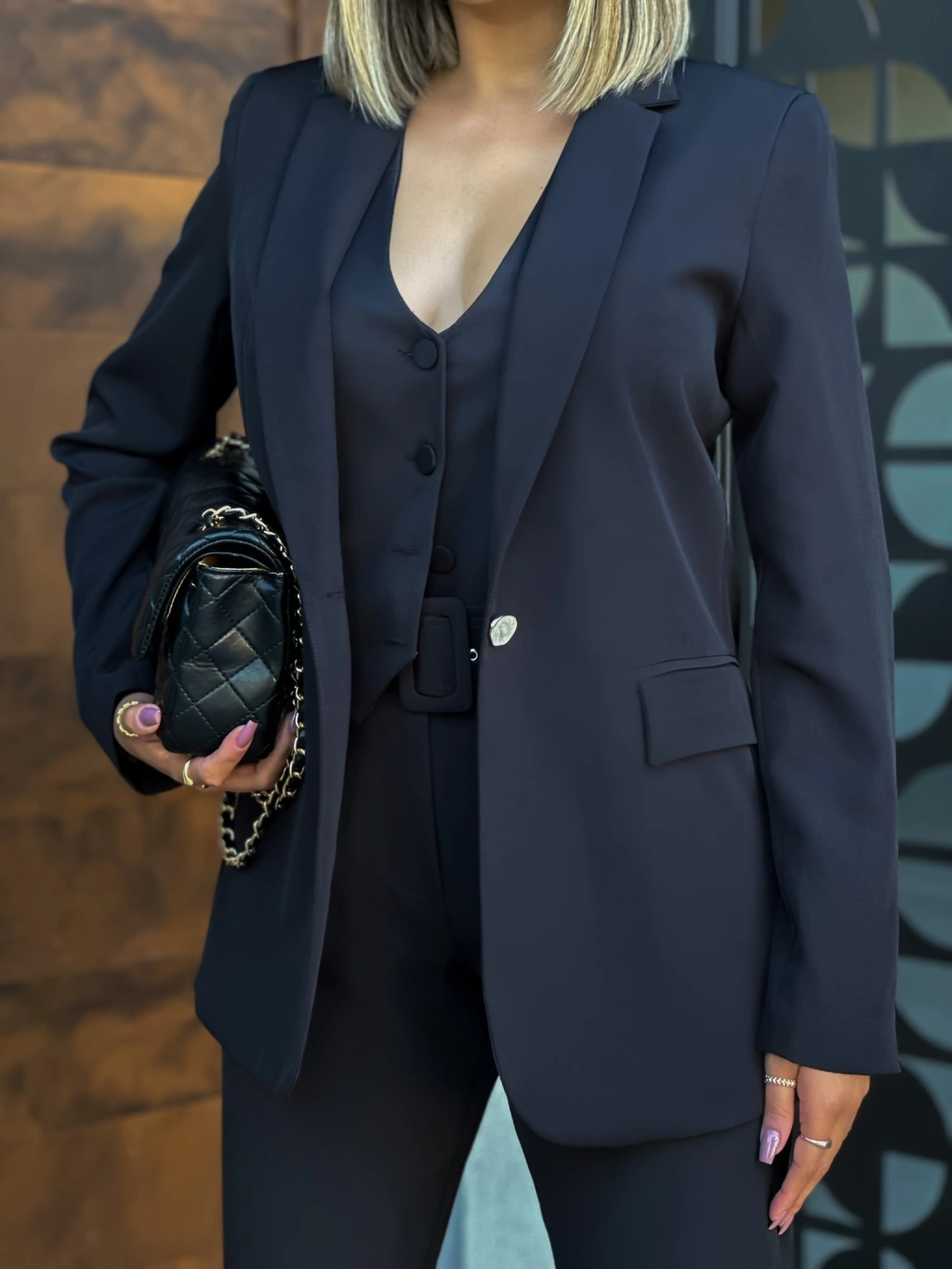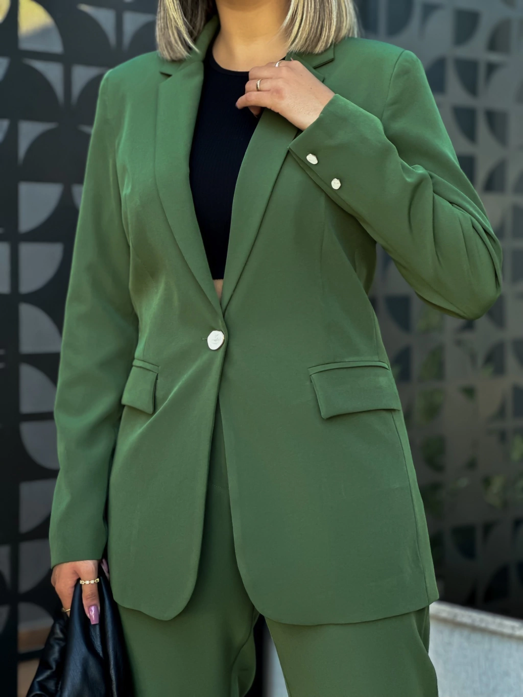 O Blazer Madrepérola é um blazer elegante e encorpado. Modelo alongado, forrado, com ombreiras, dois botões em madrepérola nas mangas e um botão em madrepérola na parte frontal do blazer.