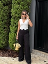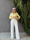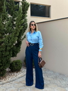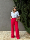 Calça Pantalona com detalhe de nervura frontal, fechamento em ziper, botão e possui dois passantes frontais mais grossos. Acompanha cinto da mesma cor e tecido da calça (cinto removível).