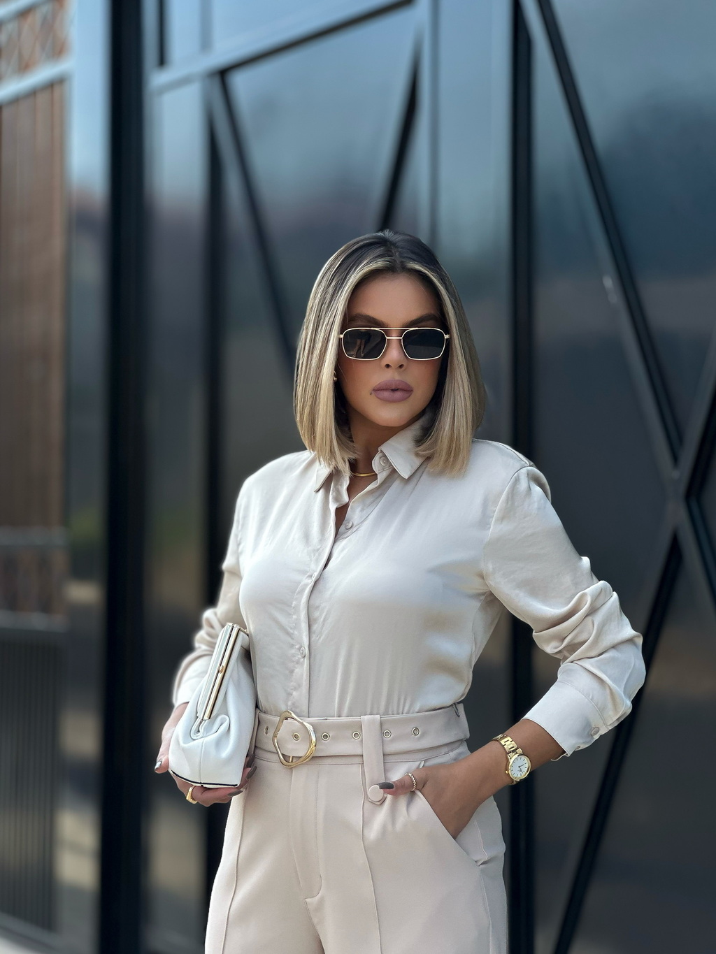 Camisa acetinada com modelagem tradicional e fechamento em botão frontal.