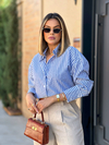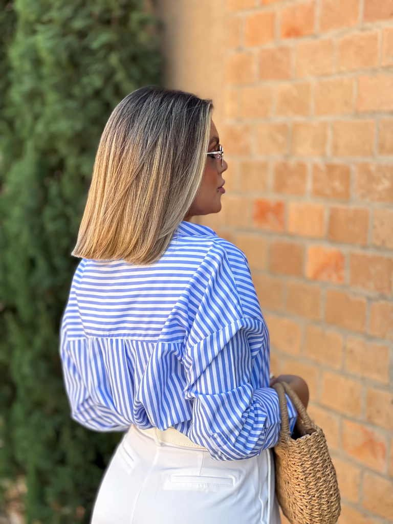 Camisa listrada com ombro deslocado e fechamento em botão frontal.