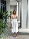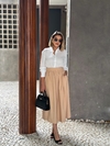 Com fechamento em zíper lateral, a saia garante um ajuste seguro e confortável, permitindo liberdade de movimento. Seu design midi e a modelagem godê conferem um toque de modernidade e classe, ideal para diversas ocasiões, desde um dia no escritório até um evento social.