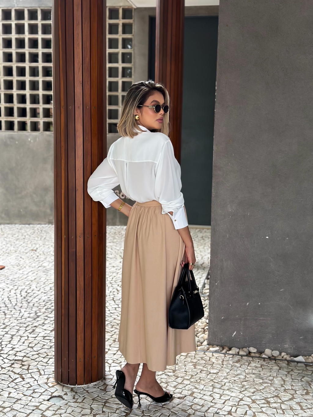 Apresente-se com elegância e sofisticação usando a nossa Saia Midi Godê Alfaiataria. Este modelo encantador é confeccionado em tecido encorpado, proporcionando um caimento perfeito que valoriza a silhueta feminina.
